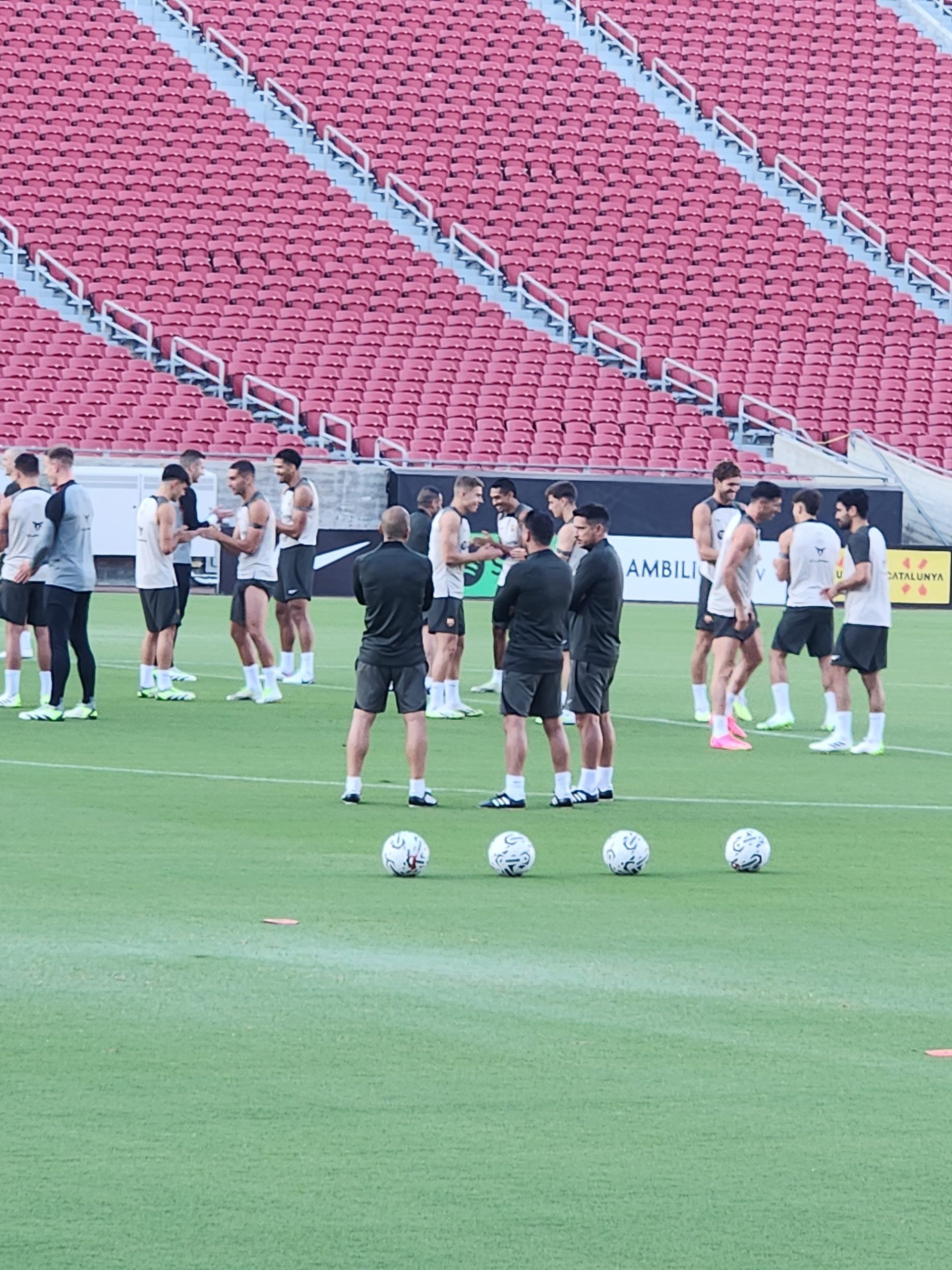 Un estadio vacío con el sitema de riego a todo vapor. La prensa espera el arribo de los jugadores y cuerpo técnico. El primero en dejarse ver en el campo es Xavi Hernández con su grupo de auxiliares, tuvieron una conversación larga en el centro del campo, imposible escucharla o ver gestos en sus rostros porque la prensa que fue acomodada, lejos de la acción, en las butacas ubicadas en medio de loa graderíos generales del estadio, se le otorgó 15 minutos una vez todo la plantilla catalana se hiciera presente al césped para ver, tomar fotos y grabar el inicio del entreno.